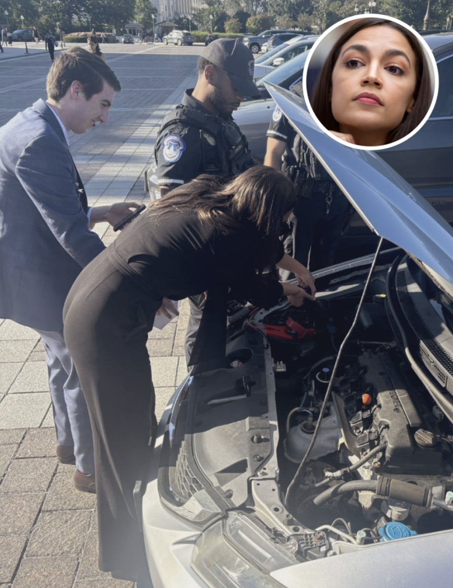 Her chief of staff, Mike Casca, wasted no time turning the moment into a social media spectacle. He posted a photo of Ocasio-Cortez working under the hood of the car, captioning it:
